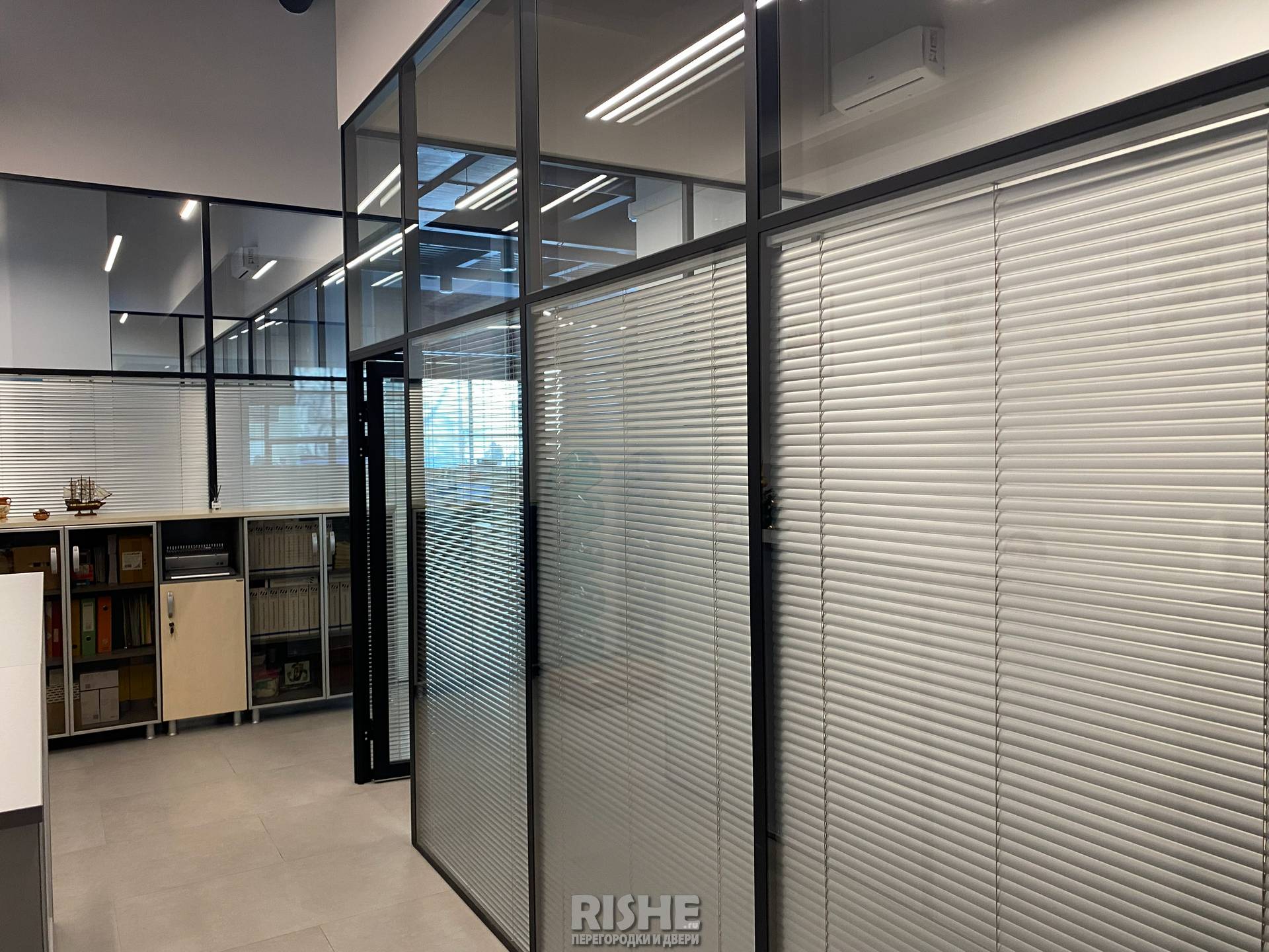 Конструкция: цельностеклянная перегородка с интегрированными межрамными жалюзи.